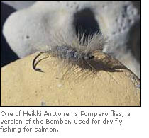Heikki 'Pompero' Anttonen, one of the "regulars" at the fair instructed casting especially the style adopted for dry fly fishing for Atlantic salmon with his Bomber varation the Pompero. And his Pompero flies were also on display. Actually it is a fly that has proven very effective also for brown trout and grayling.