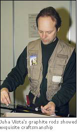 If tying a fishing fly from various materials in most cases is a skill with artistic virtues, the assembly and making of a fly rod, especially a cane rod, is a passionate craft. In Tampere Juha Viista, previously in the Finnish international fly fishing team, really showed how to make that delicate instrument for fly fishing we call a rod. Although not made from Bamboo but from graphite, his rods showed exquisite craftmanship.