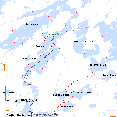 The portage from Newton to Basswood was where the pictures of rapids were taken if I remember correctly. We camped on the point marked on the map. KEEP IN MIND: we generally canoe in and set up a base camp. This is where we set up and stay up! Across the little bay to the east, there was a nice sandy beach that went out a good 20 yards into the lake. It made a great place to swim, bathe, whatever you chose. Luckily, the campsite there was empty. One of the campsite views shows the beach across the way.