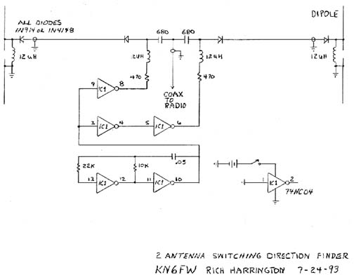 ![]() FOX HUNT At our April 1997 meeting, guest speaker Rich Harrington, KN6FW, gave us a very informative talk on transmitter hunt. With Rich's permission, the following is his write-up on that subject. He also provided the schematic of the 2-Antenna Switching Direction Finder. Rich holds transmitter hunts twice a month in different locations from Livermore to Santa Clara. If you're interested, Rich welcomes you to give him a call at 510/462-1467. Direction finding in amateur radio is like most other facets of the hobby, you need to learn all you can about it and then practice. The great part about transmitter hunting is that the practice is fun, like going on a treasure hunt or playing hide and seek. Direction finding also has its practical aspects: one is finding jammers or other pests, and another is helping in search and rescue. Anyone who has ever aimed a TV antenna or swung a beam has done radio direction finding. Most of the things you had to contend with for your TV antenna are present in VHF and UHF transmitter hunting. The three things that affect radio signals the most are topography, obstructions and reflections. UHF and VHF signals don't like going through hills. They don't even like trees and other plants much. Buildings (particularly those made of steel and concrete) obstruct and reflect signals. When transmitter hunting, always consider your surroundings. If a signal gets weaker as you approach a hill, the transmitter is most likely on the far side or behind the hill. If the direction of a signal suddenly points to a large building, it is most likely a reflection. Next I will discuss a series of systems and techniques useful for T hunting. A simple technique for radio direction finding is "body fade." Just like trees the human body attenuates radio signals. If a signal goes through you to get to your hand held radio it will be weaker than if it does not go through your body first. Using a beam usually gives you even better accuracy than body fade. However, mounting a beam to your car can be a challenge, both from wind load and from the mechanics of rotation it. When using a beam you need an attenuator. Most S meters on FM radios saturate at about 20 to 100 microvolts. As you get closer to the hidden transmitter, you have to reduce the signal to your HT to get a change on the S meter. The Adcock or interferometer is a very accurate direction finding antenna system. An interferometer can get a bearing to about one degree. It is made by placing two antennas out of phase so that when both antennas are equal distance from the transmitter, the signal nulls. They can be made with 2 simple dipoles or with 2 20 element beams. A time of arrival direction finder works similar to the Adcock antenna system. It switches between the two antennas at an audio rate, typically between 300 to 800 Hz. The switching causes an effective phase modulation in your FM radio. If the antenna are equal distance from the transmitter, there will be no phase change when the antenna are switched and no tone will be heard. This system also has a sharp null. The Doppler system gives you a direct read-out of the direction to the transmitter. It works by switching 4 antennas (3 or more can be used). As the antennas are switched, the FM radio detects the phase change from the antennas and generates a tone in the radio at the switching rate. The phase of the generated tone is compared to the signal switching the antennas to give you the direction to the transmitter. Besides radio equipment there some other things a well equipped T hunter brings along. You will need a good continuous map of the area. A book of maps like the Thomas guide will not work. Covering your map with plastic or clear shelf paper will allow you to mark bearing on it as you hunt. Most T hunts start from high locations, bearings from high location are usually more accurate than ones from low locations. Mark your initial bearing on the map and follow it! As you get closer to the transmitter mark the bearings you get along the way. Do not follow just one signal that does not match all the other bearings you have obtained as you progress. If you have a HT you are not using for the hunt while you are moving put it on the dash board. When you hear the transmitter in the HT you are very close. Now that you are close to the transmitter the hunt gets more interesting, although some hidden transmitters are easy to find, because they are on a ham's car. Some hidden transmitters are actually "hidden." When you are very close to a hidden transmitter your HT will even pickup a strong signal without an antenna connected. To reduce the signal into your HT you can wrap it in aluminum foil or slip it into a metal tube. You also could use a field strength meter. Be careful to find the correct signal, because you might find the local FM station. To eliminate this problem you could use a frequency counter. When using a counter you may need an attenuator to reduce the signal to a just detectable level. Standard T hunts are scored by the shortest distance traveled from the start to the hidden transmitter. This does not allow the use of triangulation because you are always going directly toward the transmitter. Team hunts are a situation where triangulation can be very effective. With these hunts you can place teams on two or three high locations. This can pinpoint a transmitter to within about 2,000 feet.