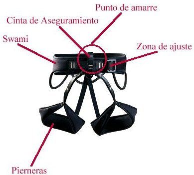 - En algunos modelos existe una cinta plana que une las pierneras con el swami y sirve exclusivamente para colocar el instrumento de aseguramiento, ya sea para asecurar o para rapelear, en ningún caso se podrá utilizar como punto de amarre.