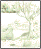Un àrbol que comienza a mostrar botones, que abriga a una pareja de pájaros, y alrededor, el terreno es seco, en el charco, se ven algunas cigueñas, y entretanto, un perro observa de lejos. |