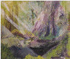 En un ambiente hùmedo e iluminado un àrbol recibe los rayos de luz en la base de su tronco y raices. Ambiente de vegetación musgosa. El canvas fuè reciclado completamente de la pulpa de diferentes papeles. |