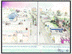 Forma tubular rodeada de formas geométricas que reflejan ciertos aspectos del alrededor, el fondo es un plano de cuadros desuniformes. |