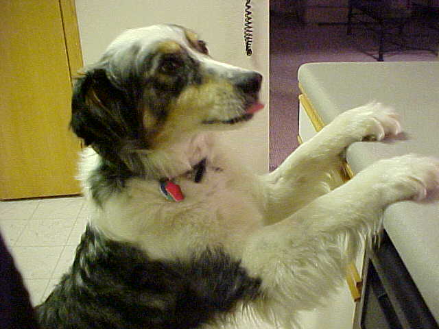 When we first got Chena, the first night we caught her licking the stick of butter off the counter. Kind of like she is in this picture. We had to work on that naughty habit! |