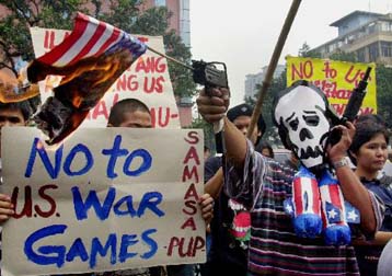 Και ενώ ο πόλεμος μαίνεται ακόμα στο Αφγανιστάν με εκατόμβες θυμάτων τόσο αμάχων όσο και αιχμαλώτων μαχητών, η επιχείρηση ¨απεριόριστη δικαιοσύνη" επεκτείνεται στις Φιλιππίνες. Στόχος το κίνημα για την αυτονομία των μουσουλμάνων στην νήσο Μιντανάο και ειδικότερα η ένοπλη οργάνωση "Αμπού Σαγιάφ", από το όνομα του ιδρυτή της, πρώην μουτζαχεντίν στο Αφγανιστάν την περίοδο της σοβιετικής εισβολής. Η οργάνωση που θεωρείται ως συνεργάτης της Αλ Κάιντα αριθμεί περί τους 7.000 ενόπλους και τα θύματα της υπερδεκαετούς ένοπλης αντιπαράθεσης με τον κυβερνητικό στρατό και την αστυνομία, φθάνουν τις 50.000 άτομα, κυρίως άμαχοι.Όπως ήδη εγράφη, (δες Αναρχικό Δελτίο νο 12 Οκτ. - Νοέμ. 2001 σελ.3), το νέο "αντίπαλο δέος" του δυτικού ιμπεριαλισμού είναι τόσο παλιό όσο και η αποικιοκρατία... Και δεν είναι η πρώτη φορά που οι αμερικάνοι επιχειρούν να δείξουν την πυγμή τους στους μουσουλμάνους του φιλιππινέζικου νότου:"οι Βορειοαμερικάνοι που κατέλαβαν τις Φιλιππίνες το 1898, αντιμετώπισαν την αντίσταση των μουσουλμάνων Μόρος στο νησί Μιντανάο, η οποία κράτησε μέχρι το 1913"... (Αν. Δελτίο σελ. 4).Σήμερα, 10 χρόνια μετά το κλείσιμο των αμερικάνικων βάσεων στις Φιλιππίνες ...οι αμερικάνοι ξανάρχονται. 650 στρατιωτικοί των ειδικών δυνάμεων των ΗΠΑ, οι οποίοι θα ενισχύσουν τις κυβερνητικές δυνάμεις έφθασαν στις 20/1 στις Φιλιππίνες κι εγκαταστάθηκαν ήδη στη βάση της Ζαμποάγκα, απ' όπου θα ενεργούν κατά των ανταρτών στο νότο της νήσου Μιντανάο και στο αρχιπέλαγος Σούλου. Κι επειδή βεβαίως οι ζωές των αμερικανών έχουν πολλαπλάσια αξία από εκείνες των άλλων, όπως και στο Αφγανιστάν, ο τοπικός στρατός θα προχωρά μπροστά ως προπομπός και οι Ράμπο θα επιχειρούν από τα μετόπισθεν και εκ του ασφαλούς... Επισήμως οι ΗΠΑ αρνούνται την άμεση εμπλοκή τους στον πόλεμο γιατί ...το απαγορεύει το σύνταγμα των Φιλιππίνων. Έτσι, και για να κρατηθούν τα προσχήματα, η συμμετοχή των αμερικανικών δυνάμεων στις επιχειρήσεις βαφτίστηκε "άσκηση". Η δήλωση ενός αξιωματικού των Ρέητζερς είναι εύγλωττη "Θα κάνουμε άσκηση σε ζωντανούς στόχους" Ελευθεροτυπία 21/1/02. Η άφιξη του αμερικάνικου στρατεύματος προκάλεσε κύμα αντιδράσεων και λαϊκών διαδηλώσεων σε όλη την έκταση της χώρας και εκφράζεται η βεβαιότητα ότι οι αμερικάνοι εκτός από το μουσουλμανικό νότο δεν θα αργήσουν να εμπλακούν και στις επιχειρήσεις στο βορρά των Φιλιππίνων όπου δρουν 12.000 μαχητές του κομμουνιστικού Νέου Λαϊκού Στρατού, ο οποίος, όπως και η "Αμπου Σαγιάφ", περιλαμβάνεται επίσης στον αμερικάνικο κατάλογο των "τρομοκρατικών οργανώσεων".31/1. Οι κοινές επιχειρήσεις των φιλιππινέζικων και βορειοαμερικάνικων στρατευμάτων ξεκίνησαν. Ο αρχηγός του γενικού επιτελείου των Φιλιππίνων, στρατηγός Ντιομέντιο Βιλανουέβα, κήρυξε την έναρξη των εκκαθαριστικών επιχειρήσεων, διάρκειας έξι μηνών, εναντίον της ισλαμικής οργάνωσης Αμπού Σαγιάφ που κατηγορείται για δεσμούς με την Αλ Κάϊντα.9/2/02. Οι ξένοι δημοσιογράφοι οι οποίοι καλύπτουν την επιχείρηση που πραγματοποιούν αμερικανοί και φιλιππινέζοι στρατιώτες εναντίον της οργάνωσης Αμπού Σαγιάφ στις νότιες Φιλιππίνες κινδυνεύουν να απαχθούν από τους μαχητές της οργάνωσης αυτής, προειδοποίησε σήμερα εκπρόσωπος του στρατού των Φιλιππίνων. Πρόκειται περισσότερο για μια έμμεση προειδοποίηση προς τους ξένους, μη ελεγχόμενους, δημοσιογράφους ώστε να μην παρευρίσκονται στο πεδίο επιχειρήσεων των αμ
