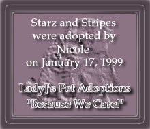 When I came upon LadyJ's home page and saw Starz and Stripes, I fell in love! They were so cute as well as the other dogs and cats she had for adoption. I knew I had to adopt Starz and Stripes because not only were they cute, but they were Patriotic! So welcome to Starz and Stripes' new home. Where they play, run, sleep, and have fun!