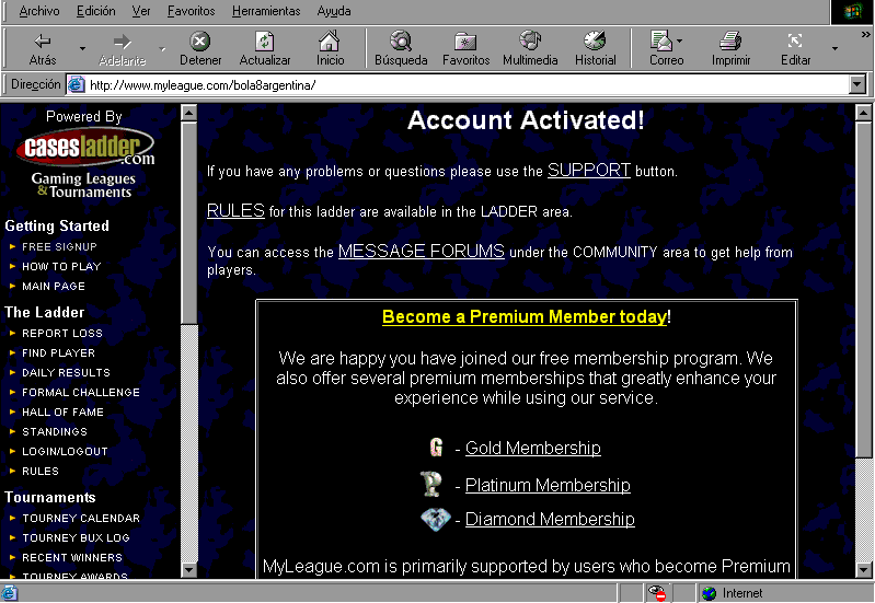 Cuenta Activada !! Si completastes correctamente todos los pasos debera abrirse esta ventana (ver imagen), de ser asi ya sos un nuevo miembro de la liga. Registrate en tu 1er Torneo haciendo click aca.