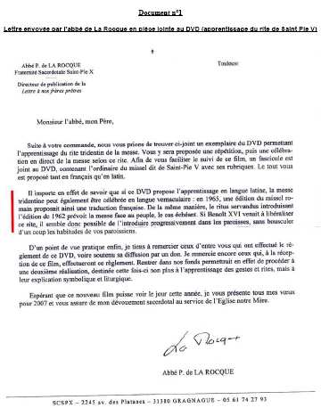 Desde mediados de diciembre de 2006, el padre de la Rocque propone enviar gratuitamente a los pretendidos «sacerdotes» conciliaires, un DVD que contiene un aprendizaje del rito de San Pío V, compuesto de un «ensayo» seguido de una misa en directo. Ese DVD va acompañado de un folleto del rito de la misa, en latín y en francés. Esta operación fue lanzada de forma oficial, con la aprobación del de Cacqueray. En una carta circular que acompaña el envío del DVD, el de La Rocque, preconiza el rito de San Pío V en francés y de cara al pueblo. Los DVDs se envían a los pretendidos sacerdotes de la iglesia conciliar de Francia. Esta difusión fue aprobada ampliamente por el padre de Cacqueray, Superior del Distrito de Francia. ¿Vio ese padre la carta firmada por el padre de La Rocque que acompaña dicho DVD? De ser así, a nombre de qué se considera el P. de Cacqueray con poder para convalidar el rito sugerido en ella (en lengua vernácula y de cara al pueblo)? ¿Él es el Papa?
