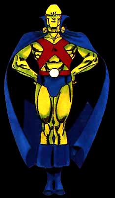 Occupation: Formerly of New York City Police, Now Adventurer Group Affiliation: Justice Leauge (All most all incarnations) First Appearance: Detective Comics #225 A plague on Mars had claimed nearly all it's people. All but one. J'onn J'onnz (as he later became known), at the last minute was sucked through time and space into 1950s Earth. There, he instantly bonded mentally with his saviour, Dr. Erdel. To help J'onn forget the horrors of his life, Erdel implanted new memories in J'onn's mind, memories of a Mars from pulp science fiction and fantasy. Along with these new memoires, J'onn developed a psycosematic weakness to fire. When the changes were completed, Erdel implanted memories of his own death, and let J'onn out, alone. Trapped on Earth, J'Onn used one of his natural talents to shape-shift his features so he could pass for a human. By altering his name to John Jones, and by brainwahing the precinct, he became a detective for the New York City Police Department. It wasn't until he moved to Denver Colorado, and met with Superman, who inspired J'Onn to use his powers publicly rather than in secret like he had been. Thus began J'Onn's career as the Martian Manhunter. Eventually he joined the Justice League of America, as a founding member, when aliens attempted an invasion. The Justice Leauge, though he's been absent a number of times, has been J'Onn's major significant work during his time on Earth. Since its inception, only he's been the one most dedicated to it, staying with it in all its incarnations, using his powers of shape-shifting, super strength, fasing abilities, telepathy, visionary powers, and flight, to lead the JL through many of its darker days. That was, at least people thought, until the JLA went through a breakdown and was reformed under Maxwell Lord. We at that time saw Superman lead the League, and a new member, Bloodwyn join the League. Bloodwynd was shrouded in mystery, until it was revealed to be J'Onn himself. He had no idea why he masqueraded as Bloodwynd, but on closer examination of the gem on his chest, it was discovered the real Bloodwynd was being held inside and tortured by his cruel beast that was the source of his power. Bloodwynd was freed, and J'Onn was free to go, but recontacted to join the League, as the leader of the Justice League Task Force, a group that had members selected from the rest of the heroes in the world based on the need of the mission. Then Judgement Day came, and the climatic