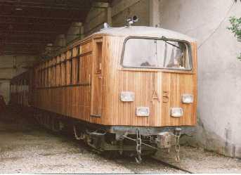 Automotriz A-3 após a reforma, com corpo coberto em madeira, no depósito de Emílio Ribas, na Vila Capivarí (Campos do Jordão-SP)