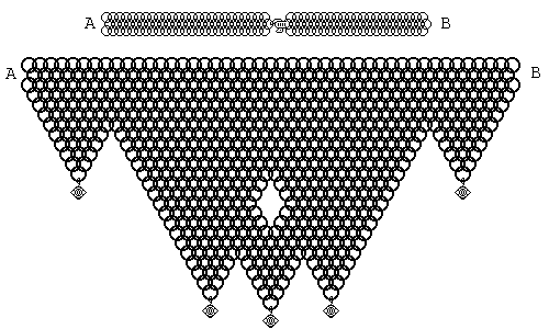 Begin by making a chain three rows wide that fits tightly (but not too tightly) around the upper neck. This should clasp easily in the back. In my picture, this would be the first three rows of rings such that the As and Bs attach together. Then, in any pattern that turn you on, extend the front down to cover the lower neck. In this case, I extend the band into two dags on the ends and a main body in the center. I have left a hole in the center of the choker which sits just around the Adam's Apple. The main body ends with three dags just inches above the lower neckline of a low sweeping dress. I have added small crystals to the ends of each dag for a touch of class. For a design this large I use aluminum links so as not to weigh too heavily on the neck and leave marks (once again, you can use steel here if you are so inclined).