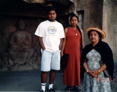 One of the caves in Ellora, a place noted for its Buddhist, Jain, and Hindu sculptures. The Buddha is in the left background.