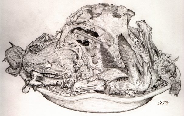 Yet another drawing assignment, this time my teacher had us draw the carcasses of our Thanksgiving turkeys. It was a pain in the butt to draw, but I like how it turned out.
