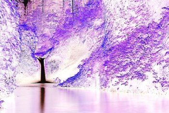| I worked my way around the pool, stopping occasionally to drink from the cold lavender water. The walls of the cliffs surrounded me on three sides as I made my way toward the waterfall. Drawn by some unknown force, I was determined to reach it by nightfall. Finally I reached the strange black water, which, closer up, was really a combination of dark purple, brown, and black. I cautiously walked behind the fall and to my amazement a human-size faerie greeted me and urged me to follow her into a cave. | ![]() |