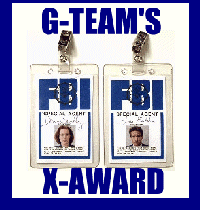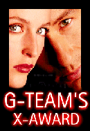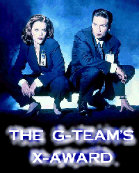 The G-Team's X-Award is given to my favorite X-Files related sites. I surf the net on this one, but in case I missed your site, you can send me your URL to MaritaSRSG@aol.com, or fill out the form below.Don't worry if I don't get back to you (which I probably won't for awhile). Once you enter, you'll always be up for the award. That doesn't mean you can't submit as many times as you like to notify me when you have revamped your site. Any cool X-Files site needn't worry about specific criteria. I wanted to make the award semi-prestigious in that I will only give out a limited amount [so that people actually can make time to visit all of the sites], yet at the same time I don't want to make it so hard to get that it frustrates...Consider the FREE AWARDS as well. Here are some choices for the award graphic, click to view: [By the way, if you see that anyone has stolen the graphics, report it to me and I will have to disintegrate them! Or make them watch "Space" over and over for eternity.] |
