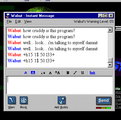 Ain't it cool? How was I inspired? Due to DataFox's good...er... average computer going "ka-poop", he's restricted to using AIM on his maxed-out sorry computer. I found my password, and now am restricted to using this piece of dung to communicate with him. Feel sorry for me. I should be shot for using this primitive crap. So, you think I suck because I think AIm is stupid and not l33t? Here is a snap shot(opens in a new window. click here to open in this window) proving just how buggy all of AOL's software is. If you're wondering how I did that, just remember that wabut knows things that you could never dream of. You've got a bug? I'll exploit it.