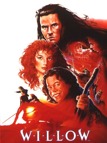 | Three different 39" X 27" theatrical posters were released that I know of. The advance poster (above left) featured the Willow logo and the slogan, "Forget all you know, or think you know," in front of a swirling red background, and the text "From the creator of Star Wars; From the director of Cocoon." This was followed by a teaser poster (basically an enlargement of Madmartigan, Willow and Sorsha in the bottom left-hand corner of the general release poster) with the tag line, "The Next Great Adventure," as seen above middle. The general release poster is shown above right. In addition, all-new art was developed for the French general release poster (measuring 47" x 63") and later resurfaced on the widescreen laserdisc jacket. (See the movie page to check it out.) | ||