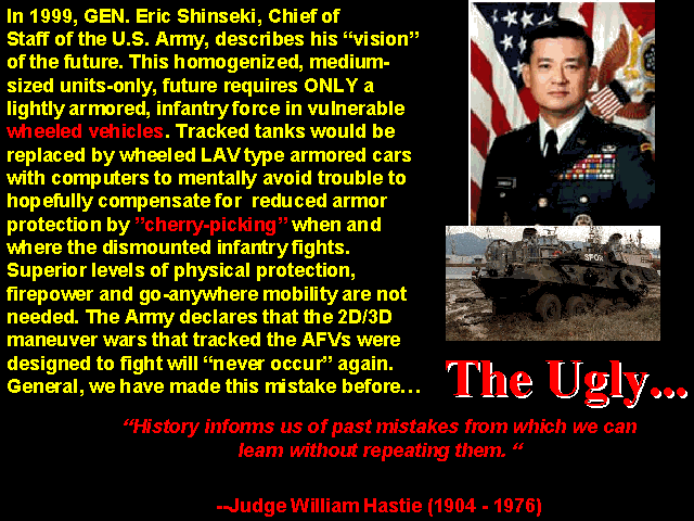 DoD and the Army is obsessed with the pursuit of personal ego gratification by ushering in Alvin and Heid Toffler's "Third Wave" of civilization where the physical doesn't count; all that matters is mentally mouse-clicking firepower precision ordnance. Afterwards, you mop up with troops in cheapo trucks. One of the false prophets of this "snake oil" was/is General Eric Shinseki. As Army Chief from 1999-2003, he oversaw outright lies and fabrications when the physical facts disputed his claims for his costly wheeled armored car units so the Army could continue to milk maximum money from Congress. That the Army was unready for Iraq II because the Army squandered $BILLIONS on these lemons for 4 years when for just a fraction of these funds we could have placed EVERY Soldier in a physically superior, up-armored M113 Gavin light track with the C4I computer packages Army Generals lust for, in a matter of days/weeks is morally bankrupt. Details: