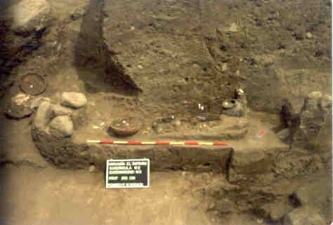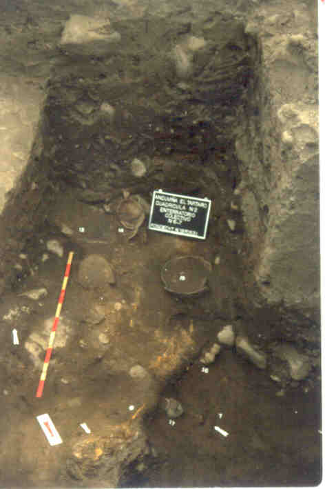 El túmulo era de forma oval, tenía un diámetro de 50x25 m y una altura de 2m. Las excavaciones permitieron identificar la presencia de cinco tumbas, algunas de las cuales posiblemente presentaban cámaras funerarias, conteniendo un total de siete individuos. Dos de las tumbas corresponden a contextos que estaban alterados por los saqueadores, mientras las restantes tres correspondían a dos tumbas simples, una de un neonato y otra de un individuo masculino adulto con una ofrenda de cuatro piezas cerámicas; y la tercera, una tumba múltiple donde habían tres individuos femeninos separadas entre sí por un elemento vegetal, posiblemente una estera, y con una rica ofrenda cerámica consistente en 23 piezas.