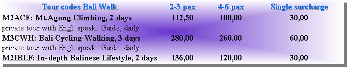 M2ACF: Mt. Agung Climbing (2 days) Departs daily Similar to Mount Lailas for Tibetan, Mount Agung (3172 m) is a sacred place for the Balinese people, where God abode, and become a major focus of divine power in the Balinese cosmos. From the highest point of this lofty active volcanic mountain, you will get a spectacular panorama of Bali all around and a chance to adore the morning glory. We will start to climb after midnight from Pura Pasar Agung. Overnight in our comfortable three seasons EUREKA tent. (B,L,D) M3CWH: Bali Cycling - Walking Package (3 days) Departs daily Day 01: After pick you up from your hotel we drive to the Lake View Restaurant in Kintamani, coffee break and preparation for the activity. Transfer by car to the starting point at the village and start for biking to Kelabangmunding, Ubud with approx. 24 km biking. Highlights: Balinese plantation, a traditional village, a handicraft and blacksmith village, terraced rice fields. Continue with leisure walk to Ubud for Lunch (L). Day 02: In the morning drive to Dasong village, we start for approx. 4,5 km across twin lakes and continue with traditional canoeing (1,5 km) and finish at Tamblingan village. From there, transfer for your lunch (L). Highlights: ancient crater, rainforest, pre-Hinduism sites, ancient temple. Day 03: Pick up from your hotel in Sanur, Kuta, Nusa Dua or Ubud by car. Onwards to Bali Nature Land Restaurant. In Jatiluwih preparation for Biking activity to Belulang Hot Spring (10 km biking) (L). Highlights: spectacular views of terraced rice fields, traditional villages, coffee and cocoa plantation, waterfall. A break at Belulang Hot Spring and transfer to Padi Venture Restaurant for lunch. After lunch transfer back to your hotel. M2IBLF: In-depth Balinese Lifestyle (2 days) Departs daily Day 01: Early in the morning we start this day for a Nature Tour at the highland tropical rainforest in central Bali with 1,5 hours trekking through a lush tropical rain forest, take a rest at a hidden temple and then we cross Lake Tamblingan with traditional canoes. From the Tamblingan village transfer to a restaurant for lunch. After lunch we will go to a traditional village where you can stay for a night at a traditional Balinese home. Free program until your dinner time. After Diner you will learn how to make a "banten" for offerings at ceremonies. Try to dress up with Balinese costume. Overnight at the village (L,D). Day 02: After having Breakfast in the village we will go on to the temple with a villager and see morning activities. Then continue with traditional cooking lesson in the village and preparations for your lunch. Take a leisure walk around the village before the return transfer to your hotel (B,L). |