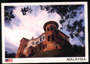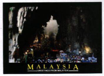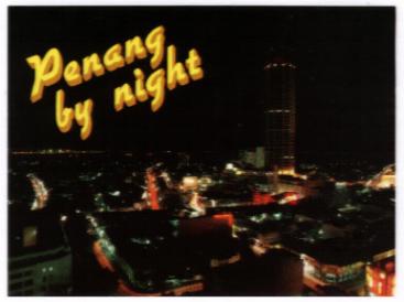 Pagoda - Built in 1890 on a hill slope, is the largest Buddhist Temple in Southeast Asia. It consists of a maze of gardens, courts and passages and the seven tier "Pagoda of Ten Thousand Buddhas". The 30 metre pagoda is a mixture of Chinese, Thai and Burmese architecture. The octagonal base is Chinese, the middle tier is Thai and the spiral dome is Burmese design. At the back of the card, there is "Greetings From Malaysia" words in samll fonts. - By Synergy Publishing Company. - SP008