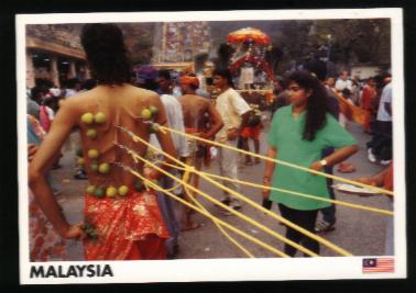 The holy Festival of Thaipusam is celebrated by acts of self-obnegation in fullfillment of a vow. Thaipusam is celebrated by the Hindus. Malaysia has a Multi-racial and multi-religious society. - By Yacine Collections. # 21242