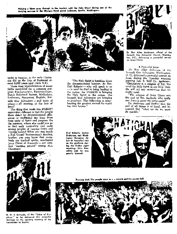 "The thing that made this FGBMFI convention different is that the people there didn't let denominational affiliations or traditional ties keep them from unity of Spirit and purpose. On the contrary, where else could you go to find such cordiality and unity among peoples of varying faiths and worship habits? When you step inside a Full Gospel Businessmen's meeting, brother, you soon know that everybody [their emphasis] are kindred spirits, worshipping Jesus Christ of Nazareth - our common "meeting ground" among ALL Christians!