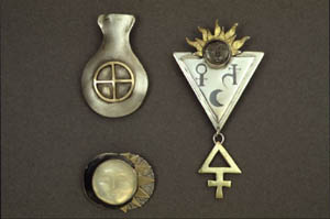 pendant modeled after the alchemical apparatus, the Bain Marie. It has been colored with Prismacolors. |