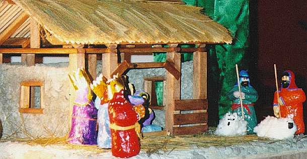 This is the manger scene made by the children in the Upper Primary Class. It was a Math/Technology/Art project that took most of the term. The characters in this scene are made of paper mache and painted with acrylic paint. |