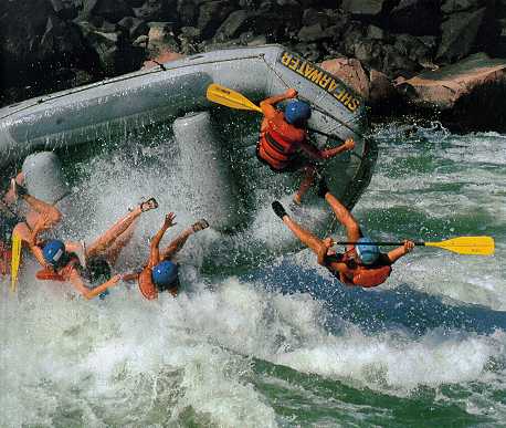 Some rafters rafting the Zambezi River. Falling out of