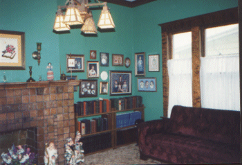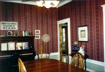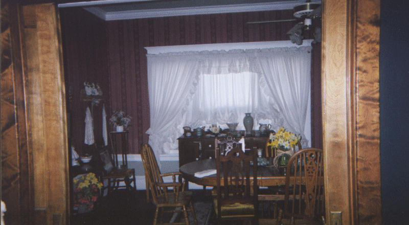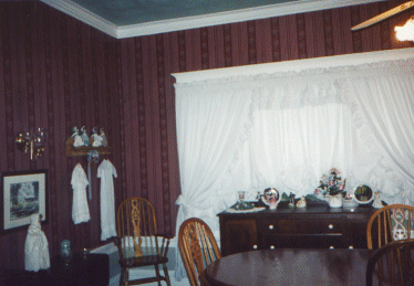 | Moving to the left (west), you enter the dining room. It is separated from the "green" room by a set of double pocket doors -- featuring the same glorious wood grain that you saw in the entry. The furniture has rearranged since the pictures were taken -- the piano is now on the south wall (the window is west) and the buffet has moved to the right of the window along that wall. The wall paper is a burgundy stripe and the ceiling is painted mint green to match the paper below the chair railing. The paper is a little dingy since the kitchen fire (1995), but everyone in the family loves the paper so it will probably stay for a long time to come anyway. You only notice the dark if you know to look for it! | |