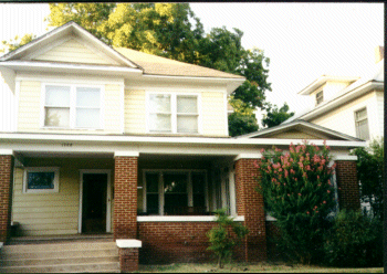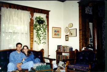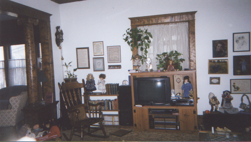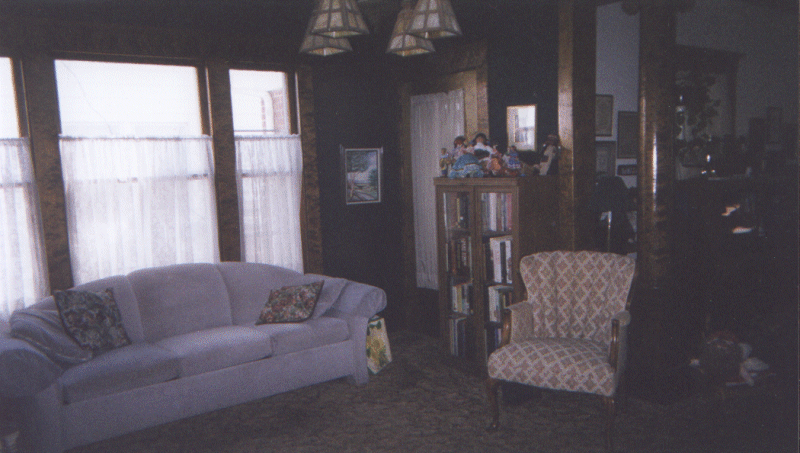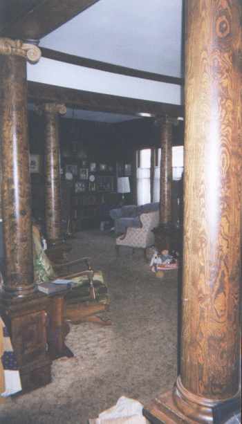 | As you turn to your right from the entry, you come into the front room. The picture with Alana and Sean helps you get a feel for the 10 foot ceilings! Here's a different view. Toward the back of the house and separated from the front room by more of the wonderful wood columns is our "green" room. The green is much darker than the picture! The fireplace is tile -- and just for looks. This one shows the view towards the southeast corner of this room. The door leads into the "sun porch" (a friend calls it a "Florida room") which is currently wasted on just storage. | |