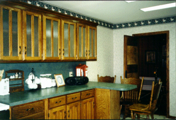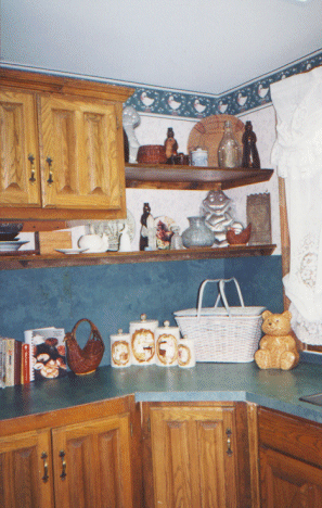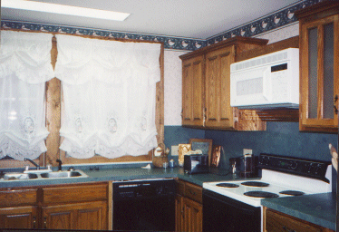 | The kitchen is a dream -- if I could only cook!! Obviously the fire in 1995 was total where the kitchen was concerned. We were very fortunate that the kitchen was the only room destroyed by the fire (but it was totalled!) The pictures start with the northeast wall (with the shelves), then the southeast wall (the window is on the east), and then the view looking to the southwest (into the dining room). | |