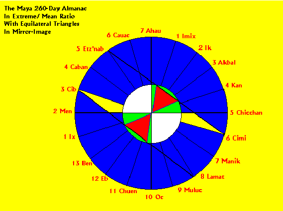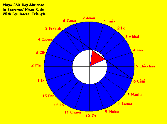 It is also true that the exposure of the equilateral triangle in this figure is a naturally occurring feature of its calendrical expression because there are only, and exactly, thirteen numerical coefficients in the structure of the tzolkin. What this means is that there are always seven "empty" places on the intersection points between the 18 degree angle lines and the circumference of the inner circle when all thirteen numbers are deployed on consecutive spaces for the currently articulated sequence of thirteen day-names. That configuration in turn leaves a total of 8 x 18 degree angles between the first and last numbers deployed in every sequence of thirteen consecutive days. Hence, every straight line connecting the first and last 18 degree angle mark which holds the first and last number always subtends a 60 degree arc on the inner circle. In other words, the equilateral triangle is always exposed by inference, at least, as each successive day-name of the tzolkin is counted. In the figure above, the number 6 (at 6 Cimi) and the number 5 (at 5 Etz'nab) are the first and last numbers and days in this sequence of thirteen days. When the 6 is moved to its next position adjacent to Cauac, marking the day-name 6 Cauac, the line subtending the base of the equilateral triangle shifts to its next location between 6 Cauac and 7 Manik. This revolving structure of equilateral triangles delineated by the revolving straight line between the first and last marked days as the count moves forward in the tzolkin is determined by the necessary conditions of the figure itself and cannot be termed coincidental to it. To suppose the Maya were unaware of this feature of their 260-day calendar seems disingenuous. To prove conclusively that they did know, however, will probably always remain elusive.