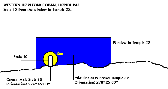 When looking through the window of Temple 22 toward the western horizon at Copan, Honduras, in the Spring, the sun sets behind Stela 10 sixteen days after Vernal Equinox at an orientation of 276*45'00". Four days later, the sun reaches the mid-line of the window at an orientation of 278*25'00. This second day always falls 20 days after Vernal Equinox and 20 days before solar zenith passage, when the sun is directly overhead at noon, and so precisely, in fact, that vertical objects do not cast a visible shadow at that time. This same sequence, but in reverse order, also occurs in the Fall, when the sun returns to these same orientations relative to solar zenith passage and Autumnal Equinox then.