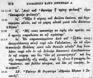 Luke 12:38 "evening watch" instead of "second or third watch". Luke 13:1-9 a "falsification" - apparantly missing.