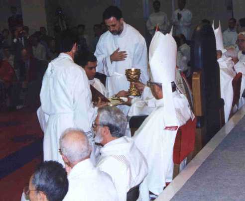 Recibiendo de manos del obispo de Takamatsu el caliz y la patena.