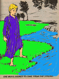 nor cold. It felt just right, he thought. He could see no sun in the sky, yet there was bright, golden light. As diamond slowly wandered along the stream he began to hear, or to think he heard, a quiet, peaceful song from somehwere. He stood still for a while, listening. The music seemed to come from the stream as it ran glistening and bubbling along. But as he stood listening it seemed that he wasn't hearing the song with his ears but in his head, as if he were dreaming. He thought he could hear words, but he wasn't sure what they were. There was something very soothing about the song. |