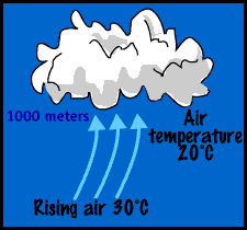 Each type is based on the same general principle. Warm air is less dense and holds more water vapour than colder air. As warm air rises into the upper troposhpere, for whatever reason, its pressure will decrease, the air mass will expand and the temperature of this air parcel will drop. This is all part and parcel of what you will learn as the Gas Laws. As the temperaure decreases the vapour pressure of the water drops and gaseuos water must condense into the liquid form. The microscopic water or cloud droplets condense together and form a cloud.