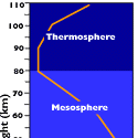 separated from the stratosphere by the stratopause and from the thermosphere by the mesopause. Temperatures in the mesosphere drop with increasing altitude to about -100°C. The mesosphere is the coldest of the atmospheric layers. In fact it is colder then Antarctica's lowest recorded temperature. It is cold enough to freeze water vapor into ice clouds. You can see these clouds if sunlight hits them after sunset. They are called Noctilucent Clouds (NLC). NLCs are most readily visible when the Sun is from 4 to 16 degrees below the horizon. The mesosphere is also the layer in which a lot of meteors burn up while entering the Earth's atmosphere. From the Earth they are seen as shooting stars. |
