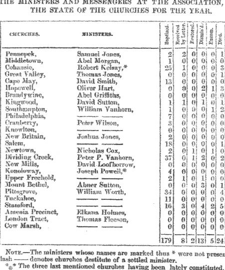 As no letters came to hand from Piscataqua, Welsh Tract, Montgomery, Scotch Plains, and several other churches belonging to this Association, we are unable to give any just account of their present number of members; a satisfaction we hope to enjoy another season.