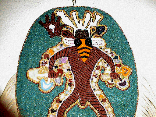 Here he is--August 11. Sewn to the braintanned/smoked leather, fringe is cut, and I've finished the fringe embellishment with green dentalium. The beadwork measures 10 1/2 inches by 8 1/4 inches. Hooray! He's done! (Of course, I still have to sew him to a vest-but no sweat there!)