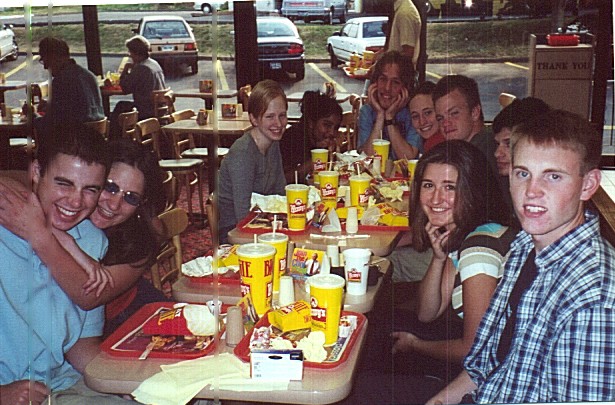 It's never too late for a hall bonding session! Basement of Nic 6, 2000-2001: Mark, Becca, Mem, Sohana, Wes, Morgan, Kevin, Sylvan, Margret, Scott, me (taking pictures) and JT (absent from dinner)