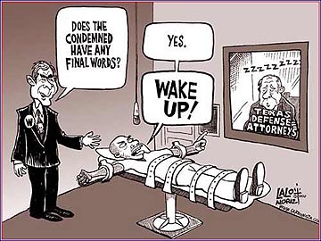 A political cartoon, describing the execution of a man whose state appointed defense attorney was SLEEPING during his trial, where in he received the Death Penalty. 3 criminals whose Lawyers were sleeping in the prosection have been denied a reprieve.