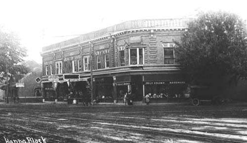 Here is the SW corner of Woodward and Maple a little before World War I. Although, because of matching facades, it may appear that you are looking at a single large structure, in reality only the corner one containing Phil Schlaack's Hardware Store is known as the Hanna Building. It was later extensively remodeled, but retained the original Hanna name. After suffering a disastrous fire in the 60's, the building was once again renovated and now contains Wachler's Jewelry store and the Standard Federal Bank. The 2nd building was constructed by Ed O'Neal to house his harness shop. The original O'Neal building continues to stand, having survived two severe fires on either side. The balance of the structure contains four store fronts and has always been known as the Johnston-Shaw Building. It, too, burned a few years ago, but has been completely restored. At the far left, beyond a vacant lot, you can see the D.U.R.Interurban Waiting Room and freight station which now houses Olga's Restaurant. Designed by the well known Detroit firm of Smith, Hinchman and Grylls, the distinctive outline of the roof with its rounded peak are visible, even today, in Olga's south wall.