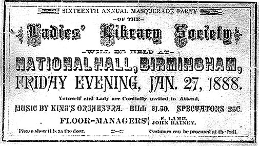 A few years after this ticket was printed The Ladies' Library Society was instrumental in the construction of Library Hall which was located for many years on the southeast corner of Old Woodward and Maple. Besides a Library, the structure also contained an Auditorium, the Police and Fire Station as well as the Village Jail. The John Rainey mentioned as a floor manager later became a Birmingham dentist.
