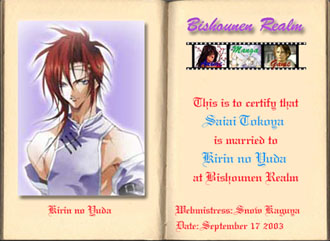 Well thats all for now, I hope your enjoying my site! Please feel free to give/correct any information I might not have or have wrong. One girl can't do it all alone. Thats why I have a partner! Also, thanks to the lovely Bishonen Realm site, I am now married! hehehe bishi wise only! Here he is...