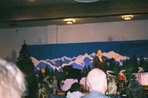 ![]() ![]() ![]() Stage is appropriately decorated for the "White Christmas" banquet, enjoyed by the Weavers. Frank Sinatra Jr. and Judy Whatshername |