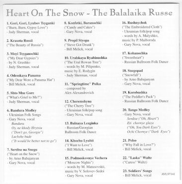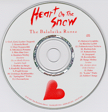 Since its inception in the early 1970's, the BALALAIKA RUSSE has grown in popularity and proficiency and is now considered the finest ensemble of its kind in the USA. This colorful sextet has performed from Washington to Maine and Europe, at such venues as society balls and affairs, at local church halls, outdoor concerts and festivals, weddings, club dates, and on the concert stage. The Balalaika Russe is the preferred band of the Russian nobility emigre society, performing at such functions as the Petrouchka Ball, the Nobility Ball, the Theological Ball, and at the Tolstoy Society. The members all come from the Tri-State area of New York, New Jersey and Pennsylvania. An excellent CD (and cassette tape) is now available featuring the Balalaika Russe. It is called "Heart on the Snow," and includes 23 of the group's most popular pieces.